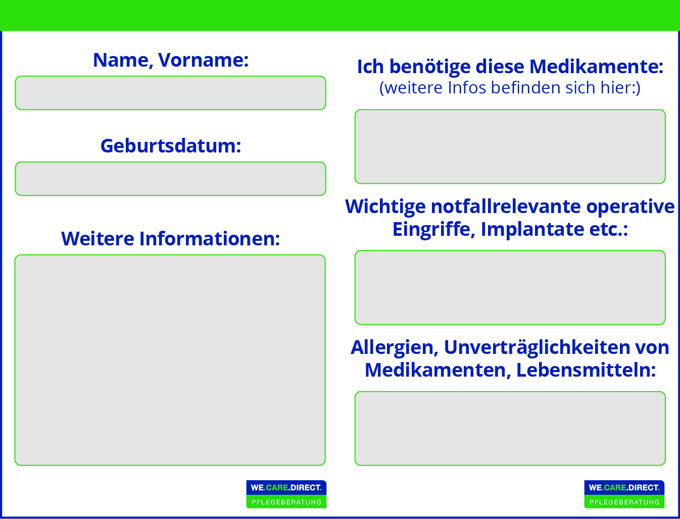 Mit einer sogenannten Notfallkarte im Geldbeutel oder einem Notfallpass auf dem Mobiltelefon haben Sie alle Wichtigen Informationen zu Ihrer Person, Ihren Kontaktpersonen und Ihrer Gesundheit immer dabei. Für den Notfall haben Helfende oder Rettungskräfte wichtige Informationen schnell zur Hand.